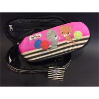 ASTUCCIO GATTINI E GOMITOLI OVALE LITTLE MEOW IN TESSUTO SETIFICATO IMBOTTITO FUCSIA E NERO A POIS, BORDI E CERNIERA NERI, INTERNO FODERATO CON ELASTICI CONTENITIVI E ULTERIORE TASCA CON CERNIERA CERNIERA. CM.23X9,5X6,5